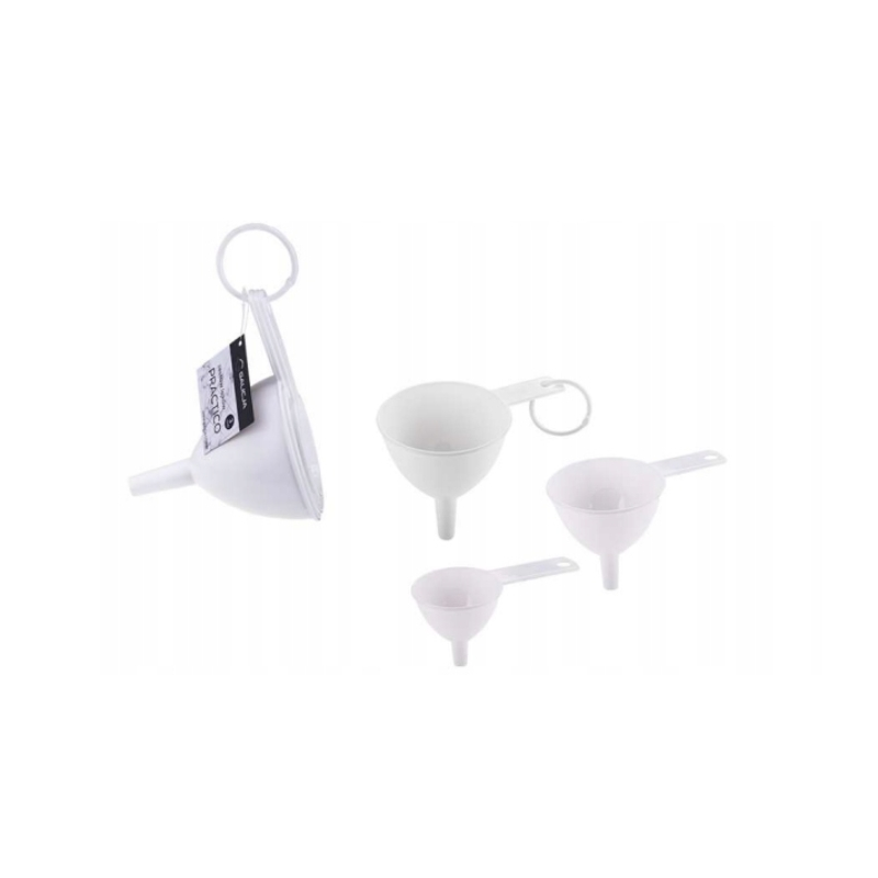 Zestaw trzech lejków kuchennych o różnych rozmiarach, przeznaczonych do precyzyjnego przelewania płynów oraz przesypywania produktów sypkich. Wykonane z trwałego i lekkiego tworzywa, idealne do kuchni, garażu lub przydomowych prac.