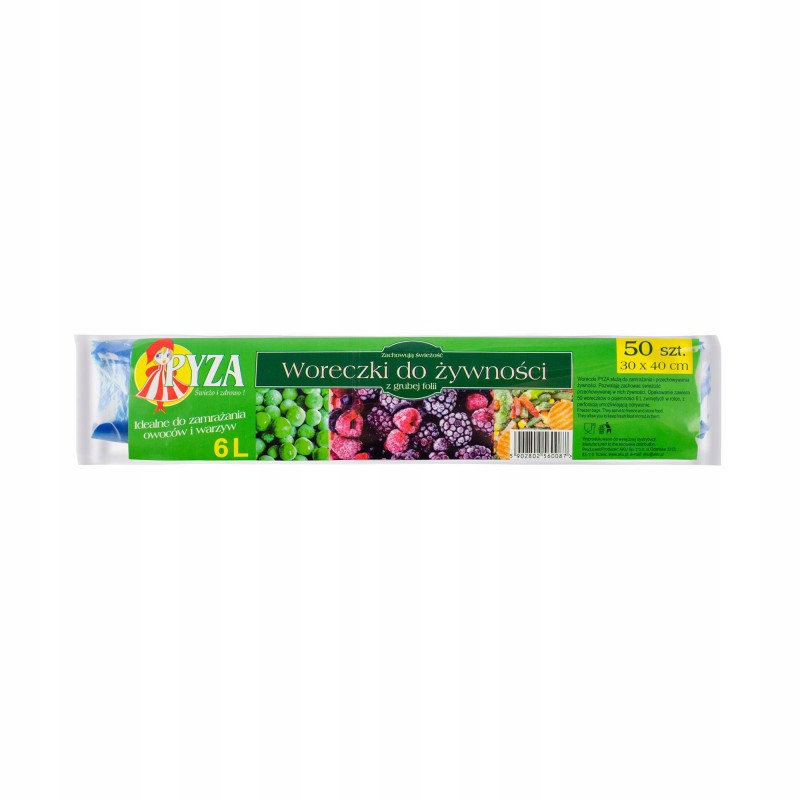 Woreczki PYZA służą do zamrażania i przechowywania żywności. Pozwalają zachować świeżość przechowywanej w nich żywności. Opakowanie zawiera 50 woreczków o pojemności 6 L zwiniętych w rolce, z perforacją umożliwiającą odrywanie. Wymiar: 30 x 40 cm.