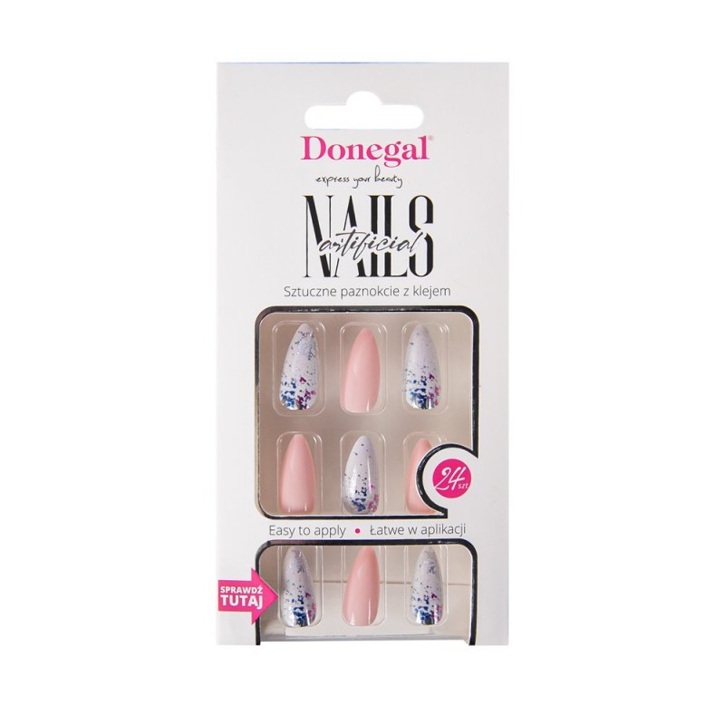 DONEGAL SZTUCZNE PAZNOKCIE Z KLEJEM ZIMOWE KONFETTI 24 SZTUKI 3079 wzorzyste paznokcie przeplatają się z różowymi.