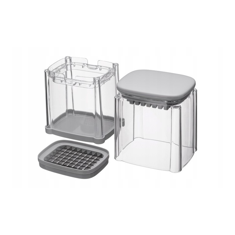Krajacz do warzyw i frytek z serii Practico to idealne urządzeni do krojeni w kostkę i słupki warzyw i owoców. Produkt składa się z pokrywy do dwuręcznego nacisku, ostrza, pojemnika na pokrojone warzywa lub owoce oraz z antypoślizgowej pokrywy.