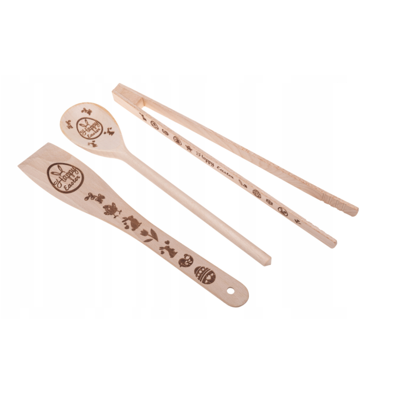 Wielkanocny grawerowany zestaw kuchenny Odette – łopatka, łyżka i szczypce wykonane ze stali nierdzewnej, trwałe i eleganckie akcesoria do serwowania potraw.