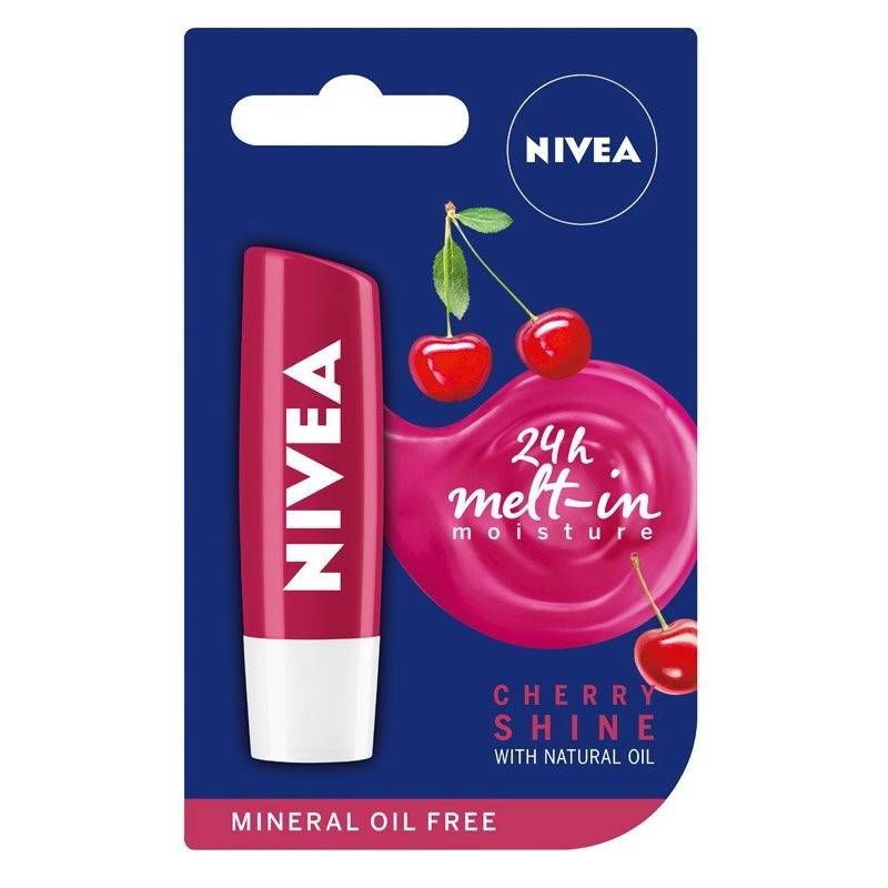 NIVEA LIP CARE POMADKA OCHRONNA SHINE CHERRY 4.8G z ekstraktami z owoców i błyszczącymi drobinkami .