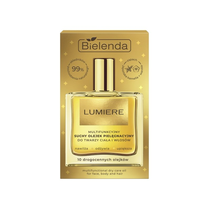 Bielenda Lumiere to luksusowy, multifunkcyjny suchy olejek pielęgnacyjny przeznaczony do twarzy, ciała i włosów. Formuła łączy naturalne oleje, takie jak olej arganowy, marula, jojoba i migdałowy, które dostarczają skórze intensywnego nawilżenia, odżywienia i blasku. Produkt szybko się wchłania, nie pozostawiając tłustego filmu, oraz wzmacnia barierę ochronną skóry, zapobiegając utracie wilgoci.