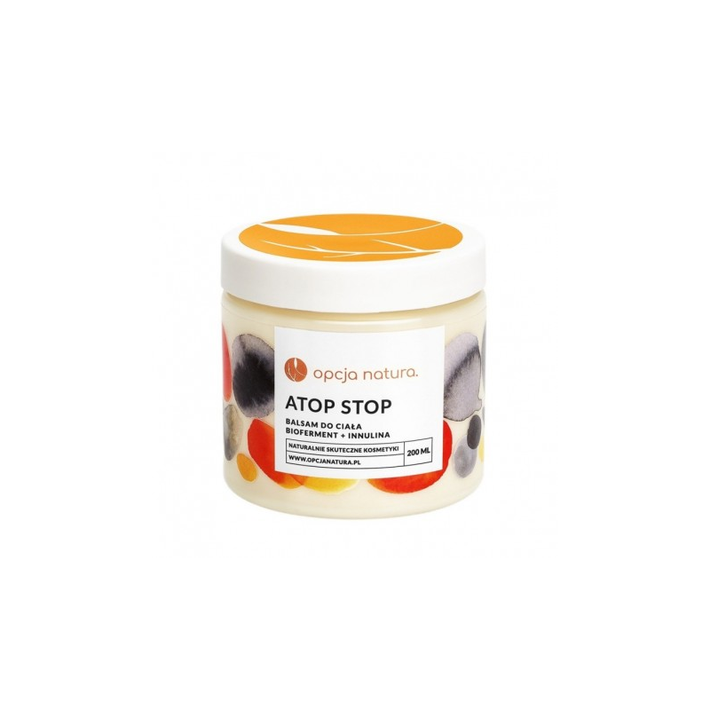 Opcja Natura Atop Stop to lekki, szybko wchłaniający się balsam do ciała, stworzony z myślą o skórze suchej, wrażliwej oraz skłonnej do podrażnień, łuszczycy czy atopii. Zawiera bioferment wspierający mikrobiom skóry, mocznik, pantenol, alantoinę i lanolinę, które intensywnie nawilżają, regenerują i odbudowują barierę ochronną skóry, nie pozostawiając tłustej warstwy. Balsam łagodzi suchość, świąd i napięcie skóry, przywracając jej miękkość, gładkość i komfort.