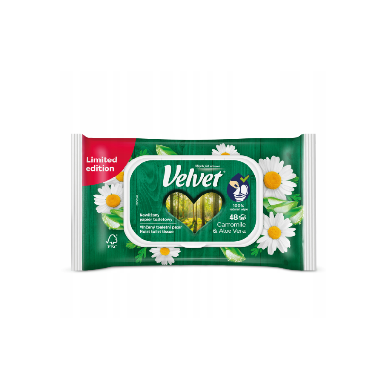 VELVET NAWILŻANY PAPIER TOALETOWY 42SZTUKI RUMIANEK I ALOES naturalna pielęgnacja dla całej rodziny.