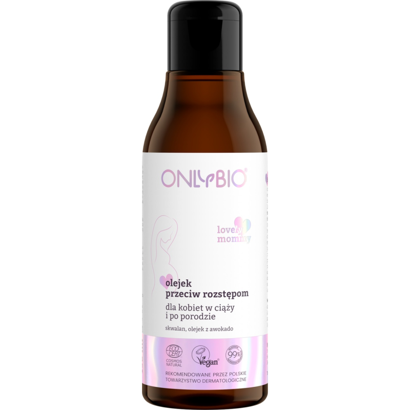OnlyBio Lovely Mommy olejek przeciw rozstępom 150 ml to naturalny kosmetyk pielęgnacyjny, który intensywnie nawilża, odżywia i wspiera elastyczność skóry, co może pomagać w profilaktyce rozstępów. Lekka formuła, szybkie wchłanianie i przyjemny zapach sprawiają, że produkt jest idealny do codziennej pielęgnacji skóry ciała, szczególnie dla przyszłych i świeżo upieczonych mam.