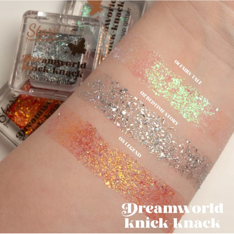 Stars from the Stars Dreamworld Rozświetlacz Brokat #01 „Fairy” to uniwersalny kosmetyk, który łączy funkcję rozświetlacza i brokatu. Nadaje cerze bajeczny, świetlisty wygląd i sprawia, że każdy makijaż nabiera magicznego charakteru. Idealny dla tych, którzy kochają błysk i chcą zawsze wyglądać olśniewająco.