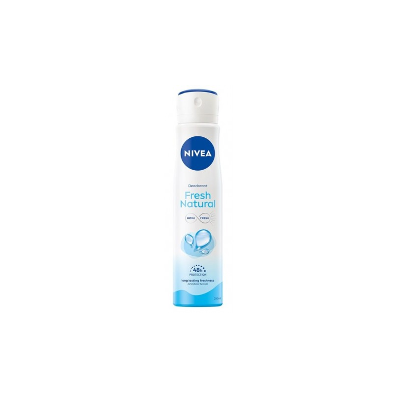 NIVEA Fresh Natural to damski dezodorant w sprayu, który zapewnia świeżość i komfort przez cały dzień. Dzięki formule neutralizującej bakterie odpowiedzialne za nieprzyjemny zapach zapewnia ochronę do 48 godzin. Produkt nie zawiera soli aluminium, pozwala skórze oddychać i ma delikatny, morski zapach, który dodaje lekkości i subtelności.