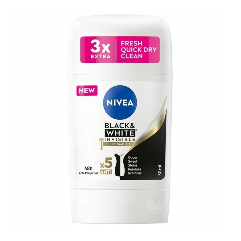 NIVEA BLACK WHITE INVISIBLE SILKY SMOOTH DEZODORANT W STYFCIE DAMSKI 50ML ochrona przed potem i nieprzyjemnym zapachem.