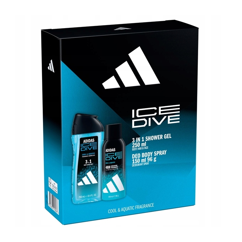 Adidas Ice Dive to zestaw dla mężczyzn pełnych energii, ceniących świeżość i komfort. Połączenie antyperspirantu i żelu 3-w-1 gwarantuje kompleksową pielęgnację i długotrwałe uczucie czystości. Idealny wybór na prezent lub jako codzienny zestaw pielęgnacyjny.