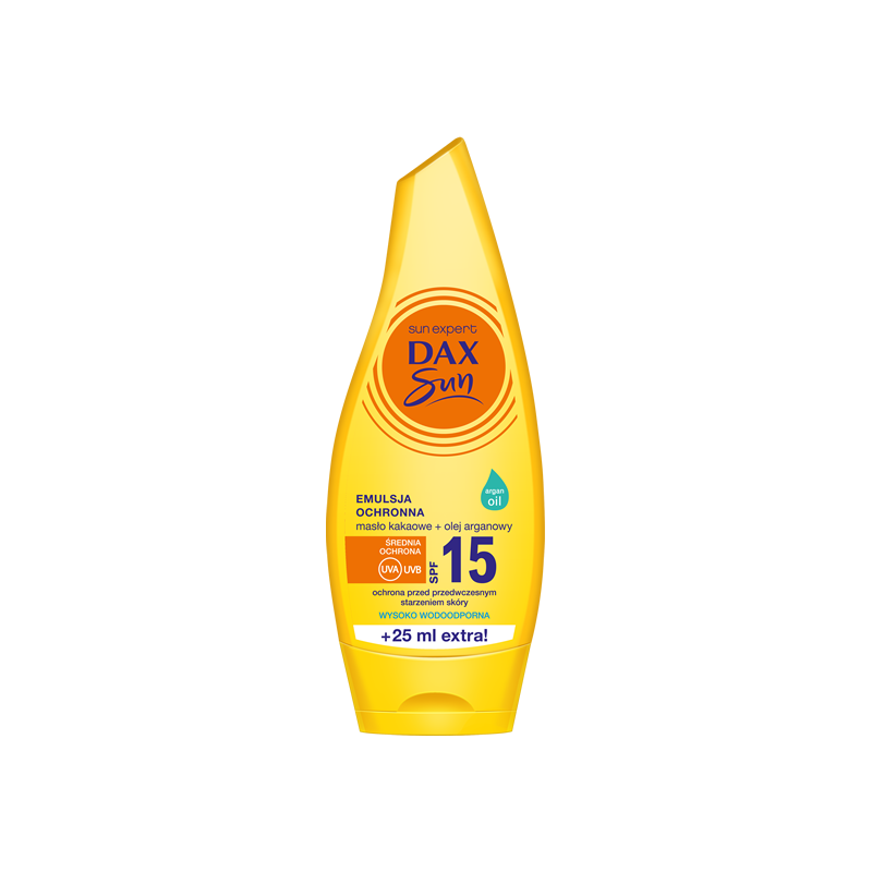 DAX SUN EMULSJA DO OPALANIA SPF15 175ML ZAPEWNIA BEZPIECZEŃSTWO SKÓRZE O JASNEJ KARNACJI I ŚREDNIEJ WRAŻLIWOŚCI NA PROMIENIE SŁONECZNE.