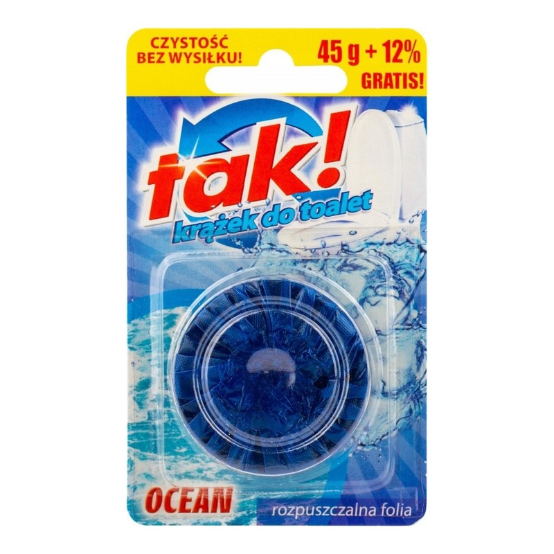 Krążek do wc TAK! odświeża i czyści muszlę klozetową. Zapobiega odkładaniu się kamienia oraz gromadzenia się brudu, utrzymując długotrwałą czystość w toalecie. Daje obfitą pianę, barwi wodę, jest bardzo wygodny w użyciu. Gramatura: 50g