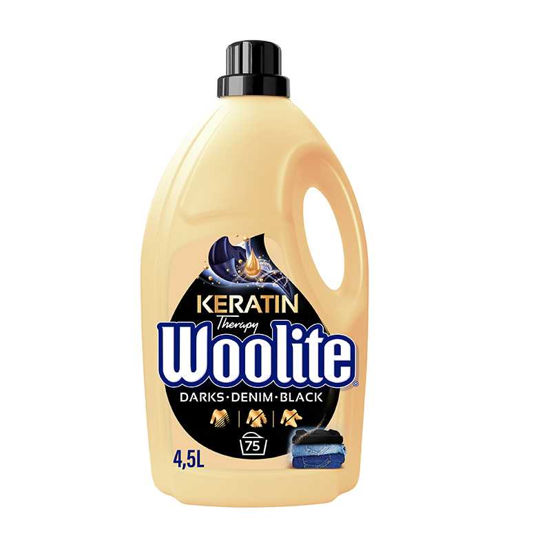 WOOLITE PŁYN DO PRANIA 4,5L DARE CZERNI CIEMNYCH KOLORÓW I JEANS Z KERATYNĄ utrzymuje blask tkanin.