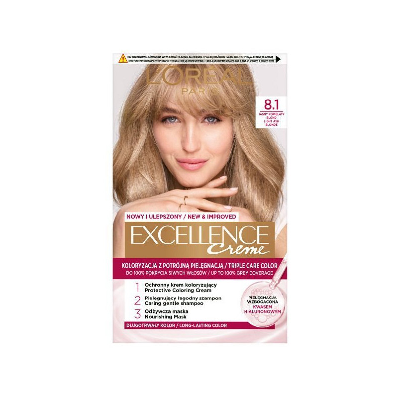 LOREAL EXCELLENCE CREME FARBA DO WŁOSÓW NR 8.1 JASNY POPIELATY BLOND zapewnia idealne pokrycie siwych włosów oraz doskonale jednolity kolor.