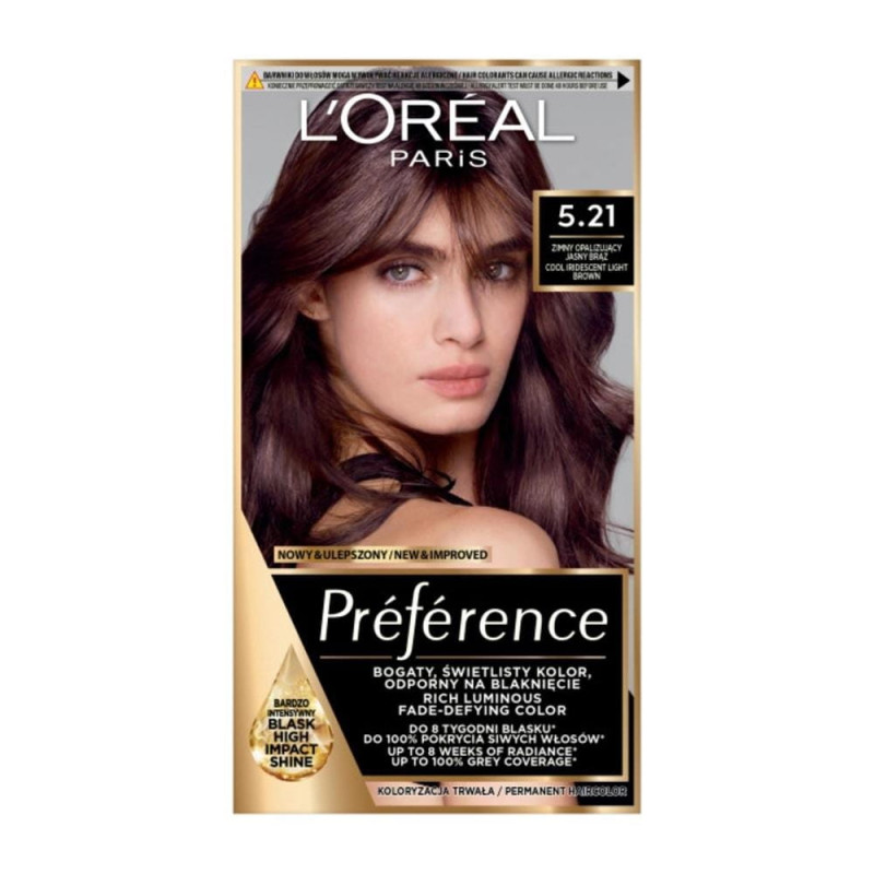 LOREAL PREFERENCE CREME FARBA DO WŁOSÓ NR 5.21 ZIMNY OPALIZUJĄCY JASNY BRĄZ zapewnia idealne pokrycie siwych włosów oraz doskonale jednolity kolor.