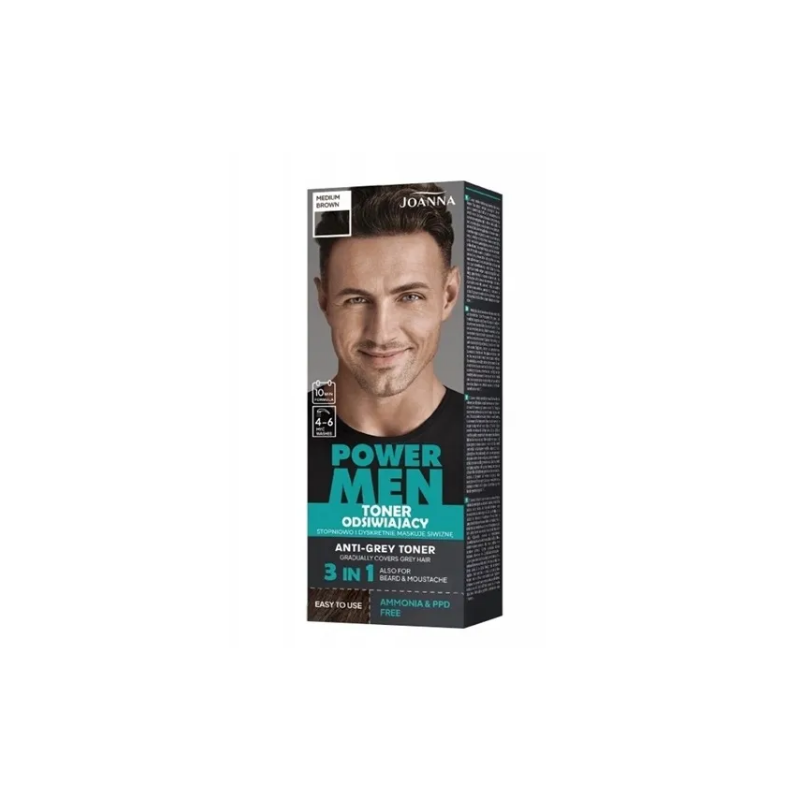 JOANNA POWER MEN TONER ODSIWIAJĄCY DO WŁOSÓW 80G 03 MEDIUM BROWN dyskretne krycie siwizny bez sztucznego efektu.