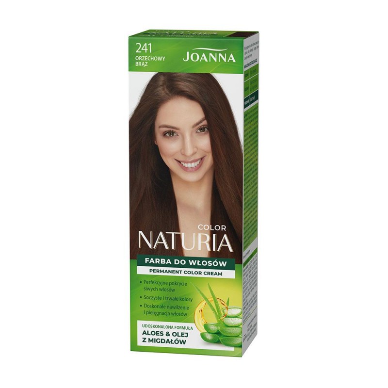 JOANNA NATURIA COLOR FARBA 241 ORZECHOWY BRĄZ nadaje włosom piękny połysk, głęboki kolor i zdrowy wygląd, poziom III kolor trwały, testowany dermatologicznie.