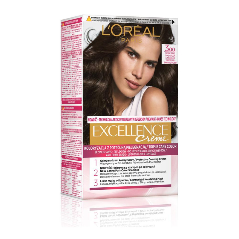 LOREAL EXCELLENCE CREME FARBA DO WŁOSÓW NR 3.00 CIEMNY BRĄZ zapewnia idealne pokrycie siwych włosów oraz doskonale jednolity kolor.
