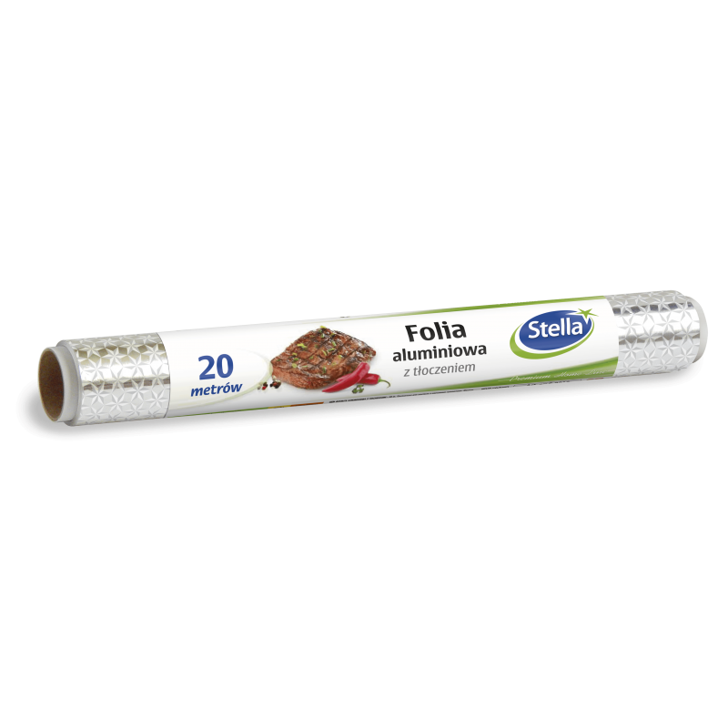 STELLA FOLIA ALUMINIOWA Z TŁOCZENIEM 20M ROLKA służy do grillowania, pieczenia, przechowywania, zamrażania i odgrzewania potraw.