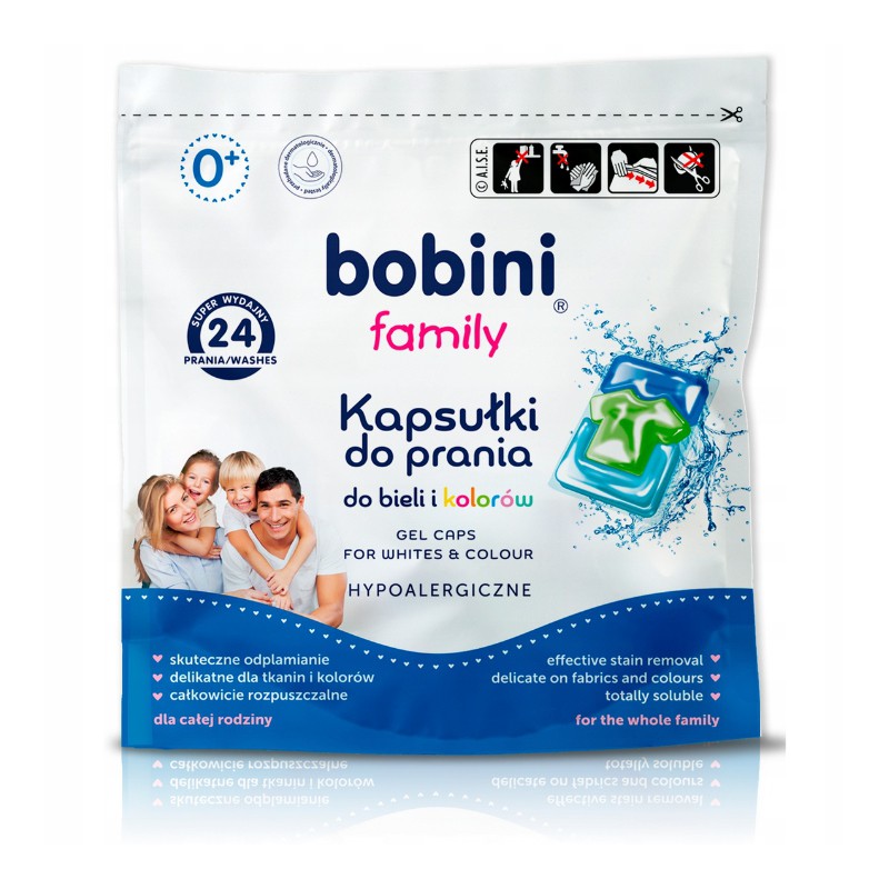 Linia Bobini Family powstała z myślą o całej rodzinie. Hypoalergiczne kapsułki są idealne do dziecięcych ubranek, doskonale nadają się do prania odzieży dorosłych. Zostały przebadane dermatologicznie.