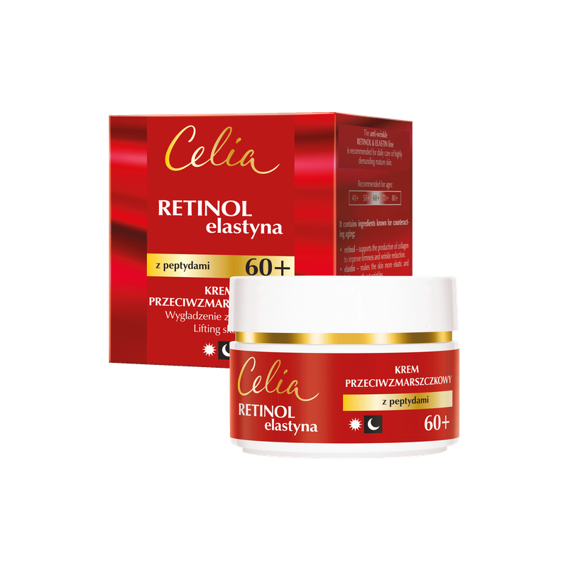 CELIA RETINOL ELASTIN KREM DO TWARZY 50ML 60+ PRZECIWZMARSZCZKOWY Z PEPTYDAMI NA DZIEŃ I NA NOC uelastycznia skórę i pomaga wygładzić zmarszczki.