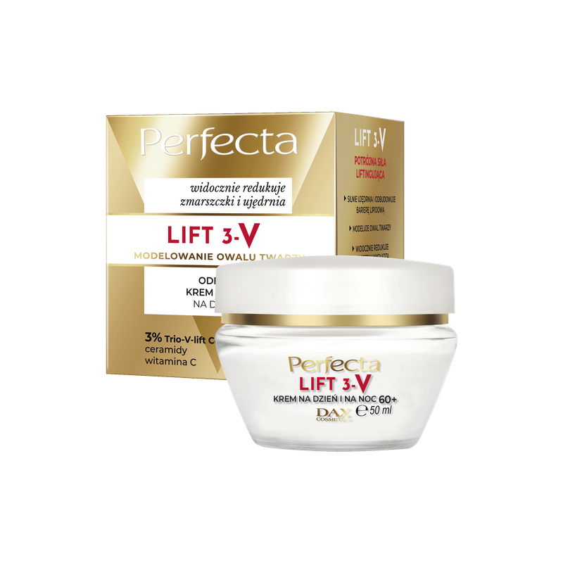 PERFECTA LIFT 3V KREM DO TWARZY 50ML 60+ ODBUDOWUJĄCY DZIEŃ I NA NOC unikalne połączenie działające z potrójna siłą na modelowanie owalu twarzy.