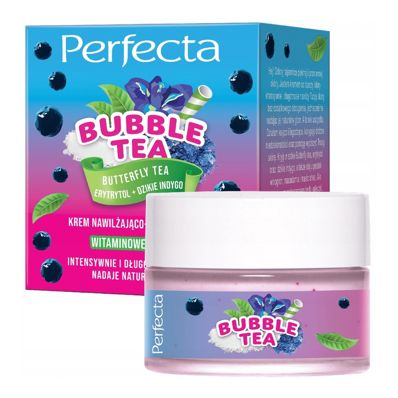 Krem nawilżająco‑rozświetlający z linii Bubble Tea marki Perfecta intensywnie nawilża skórę, dodaje jej naturalnego blasku oraz działa kojąco i łagodząco. Formuła zawiera ekstrakt z Butterfly Tea (niebieskiej herbaty), erytrytol, dzikie indygo, olej z pestek winogron, olej macadamia oraz masło shea. W trakcie aplikacji krem uwalnia witaminowe kuleczki, które wspierają odżywienie skóry.
