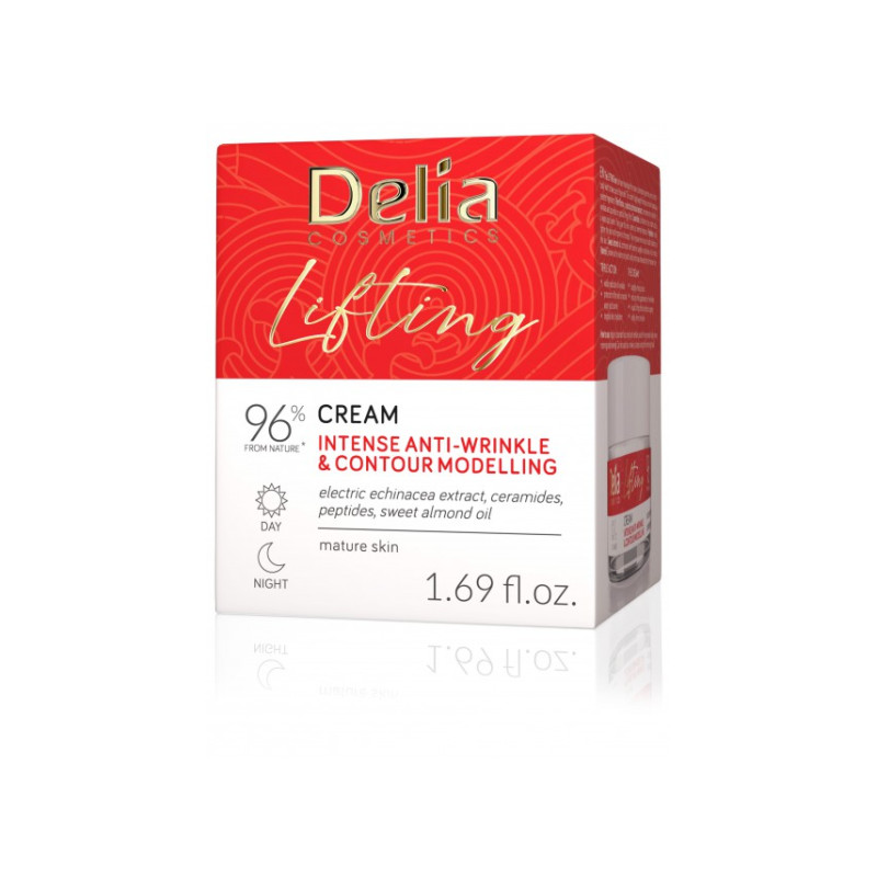DELIA LIFTING KREM DO TWARZY 50 ML PRZECIWZMARSZCZKOWY DZIEŃ I NOC SILNIE MODELUJĄCY zawiera aż 96% składników pochodzenia naturalnego.