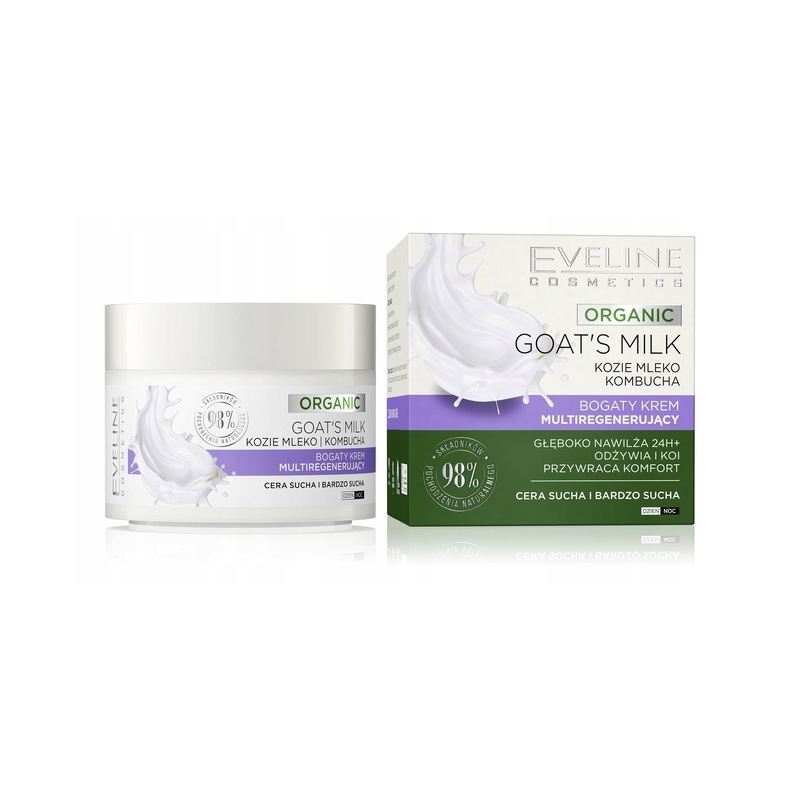 Krem multiregenerujący Eveline Organic Goat’s Milk to intensywnie odżywczy kosmetyk przeznaczony do pielęgnacji skóry suchej i bardzo suchej. Zawiera 98% składników pochodzenia naturalnego, w tym kozie mleko, kombuchę, masło shea, kwas hialuronowy oraz naturalne oleje: arganowy, awokado i migdałowy. Skutecznie nawilża, wygładza oraz regeneruje skórę, redukując uczucie suchości i napięcia. Idealny do stosowania na dzień i na noc, także jako baza pod makijaż.