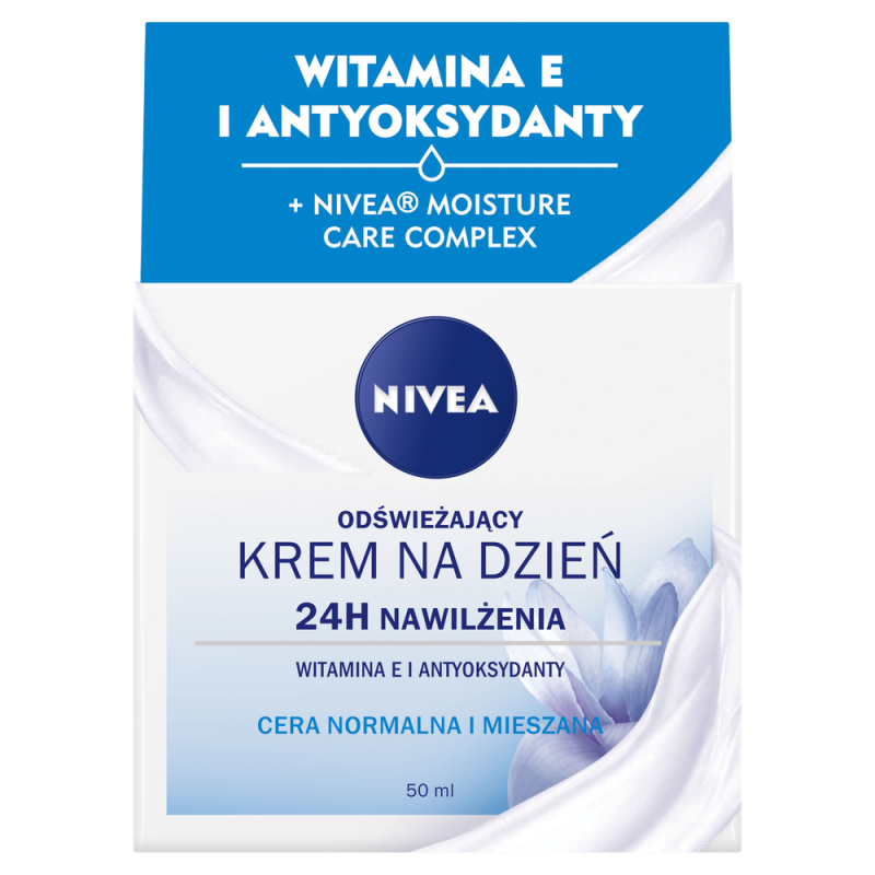 Odświeżający Krem Na Dzień 24h Nawilżenia z witaminą E oraz antyoksydantami został przeznaczony cerze normalnej i mieszanej. Krem wzbogacony o witamine E i formułę Nivea Moisture Care Complex przywraca naturalną równowagę i poziom nawilżenia aż do 24h. Krem odświeża cerę, nadaje całodniowe uczucie orzeźwienia i zapobiega przedwczesnemu starzeniu się skóry. Zawiera antyoksydanty, które chronią przed szkodliwymi czynnikami zewnętrznymi i stresem oksydacyjnym.