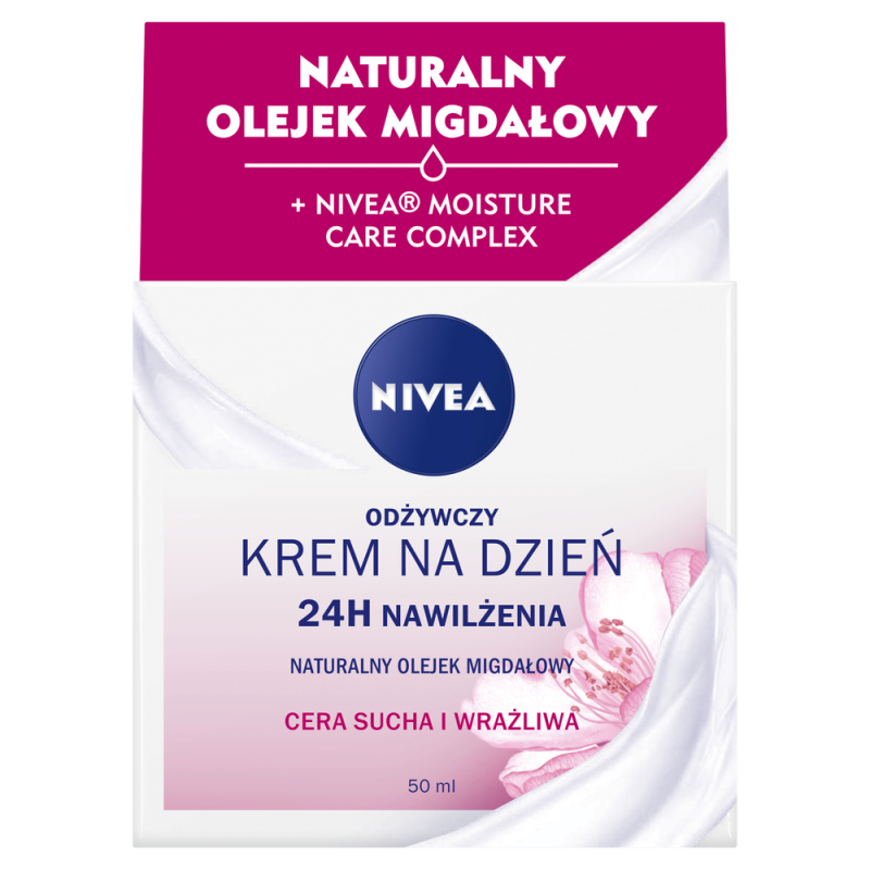 NIVEA® Odżywczy Krem na Dzień 24H Intensywnego nawilżenia zawiera wyjątkową formułę : NIVEA® Moisture Care Complex, Naturalny olejek migdałowy, Masło shea i Antyoksydanty. Intensywnie nawilża skórę do 24 godzin, przywracając naturalną równowagę i poziom nawilżenia skóry. Głęboko odżywia skórę, a dzięki bogatej formule wygładza cerę. Chroni skórę przed negatywnym wpływem czynników zewnętrznych i stresem oksydacyjnym.