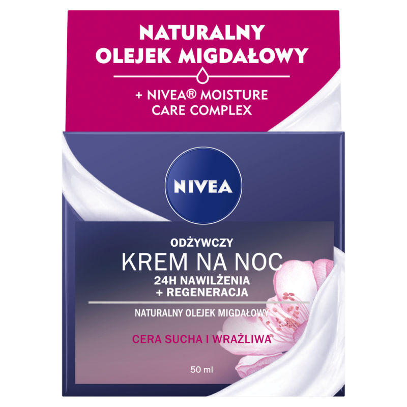 24H NAWILŻENIA ODŻYWCZY KREM NA NOC CERA SUCHA I WRAŻLIWA NIVEA® Odżywczy Krem na Noc 24H Intensywnego nawilżenia + Regeneracja zawiera wyjątkową formułę : NIVEA® Moisture Care Complex, Naturalny olejek migdałowy, Masło shea i Antyoksydanty.Intensywnie nawilża skórę do 24 godzin, przywracającjej naturalną równowagę i właściwy poziom nawilżenia. Głęboko odżywia i dzięki bogatej formule wygładza Twoją cerę. Wspomaga naturalny proces nocnej regeneracji skóry. Chroni skórę przed stresem oksydacyjnym i wolnymi rodnikami następnego dnia.