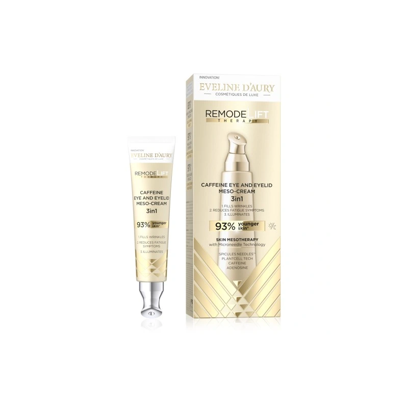 Eveline D’Aury RemodeLift Therapy Kofeinowy Mezo-Krem Pod Oczy 3w1 to innowacyjny krem, inspirowany nowoczesnymi zabiegami mikroigłowej mezoterapii. Dzięki zaawansowanej technologii Spicules Needles™, opartej na mikroigłach z gąbki słodkowodnej Spongilla Spicule, krem skutecznie inicjuje procesy odmładzające, docierając głęboko w skórę i wspierając jej naturalną regenerację.