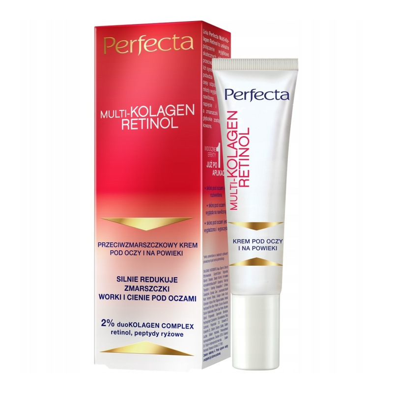 Perfecta Multikolagen Retinol krem pod oczy i na powieki 15 ml to skuteczny kosmetyk przeciwzmarszczkowy, który wygładza, nawilża i rozświetla delikatną skórę wokół oczu. Zawartość retinolu, kolagenu i peptydów poprawia jędrność i przywraca świeży, wypoczęty wygląd.