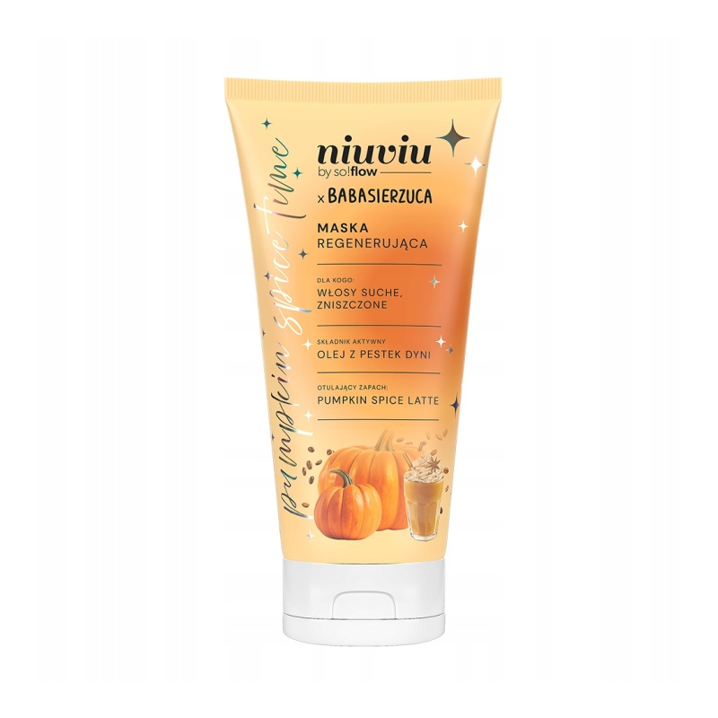 Maska regenerująca Niuviu x Babasierzuca Pumpkin Time to intensywnie odżywcza formuła stworzona z myślą o włosach suchych, zniszczonych i osłabionych. Zawiera naturalne składniki, takie jak olej z pestek dyni, wodę ryżową, olej makadamia oraz masło kakaowe, które dogłębnie nawilżają, odżywiają i wygładzają włosy. Produkt odbudowuje strukturę pasm, przywraca miękkość, elastyczność i naturalny blask, chroniąc je przed przesuszeniem i uszkodzeniami. Przyjemny aromat inspirowany pumpkin spice latte uprzyjemnia codzienną pielęgnację włosów.