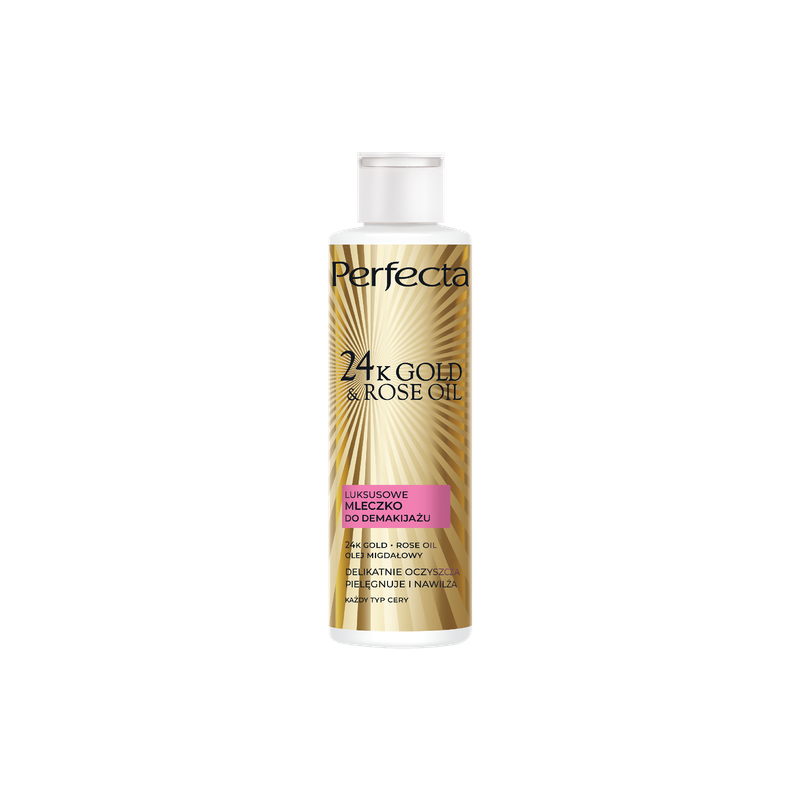 PERFECTA 24K GOLD ROSE OIL MLECZKO DO TWARZY 200ML LUKSUSOWE delikatnie oczyszcza skórę z wszelkich zanieczyszczeń i makijażu, pozostawiając ją odświeżoną, ukojoną i nawilżoną.