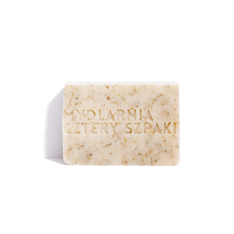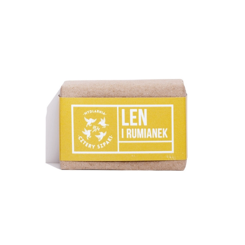 MYDLARNIA CZTERY SZPAKI MYDŁO W KOSTCE 110G LEN I RUMIANEK dzięki właściwościom kojącym idealnie sprawdzi się w codziennej pielęgnacji skóry wymagającej, skłonnej do przesuszania i alergii.