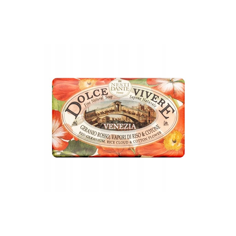 Mydło Nesti Dante z linii Dolce Vivere „Wenecja” to luksusowy kosmetyk inspirowany urokami włoskiego miasta Wenecja. Wykonane z naturalnych składników, oferuje delikatne oczyszczenie skóry oraz subtelne nawilżenie. Jego kompozycja zapachowa łączy nuty czerwonego geranium, pudru ryżowego i kwiatu bawełny, przenosząc użytkownika w atmosferę włoskich ogrodów.