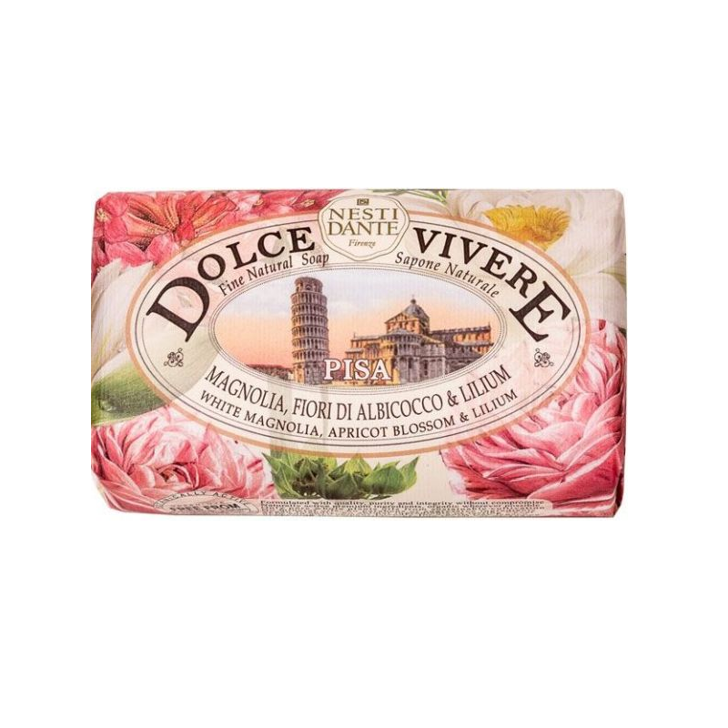 Mydło Nesti Dante z linii Dolce Vivere „Pisa” to luksusowy kosmetyk inspirowany urokami włoskiego miasta Piza. Wykonane z naturalnych składników, oferuje delikatne oczyszczenie skóry oraz subtelne nawilżenie. Jego kompozycja zapachowa łączy nuty białej magnolii, kwiatu moreli i lilii, przenosząc użytkownika w atmosferę włoskich ogrodów.