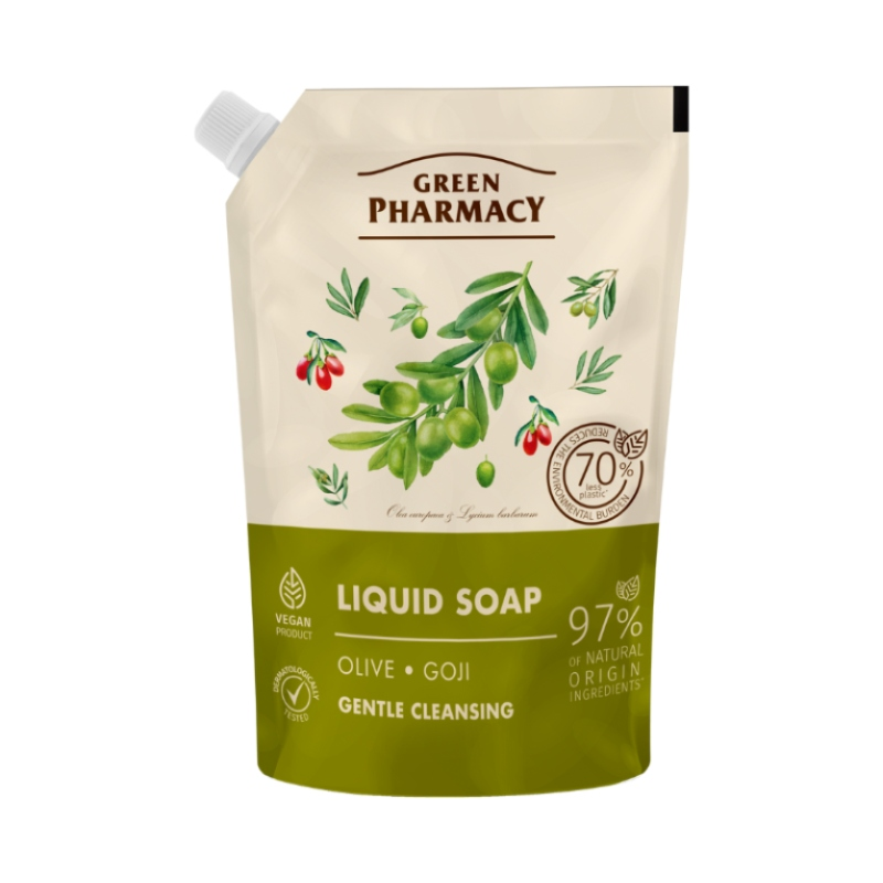 GREEN PHARMACY MYDŁO W PŁYNIE ZAPAS 460ML DOYPACK OLIWKA odżywia skórę i zapobiega jej wysuszeniu.