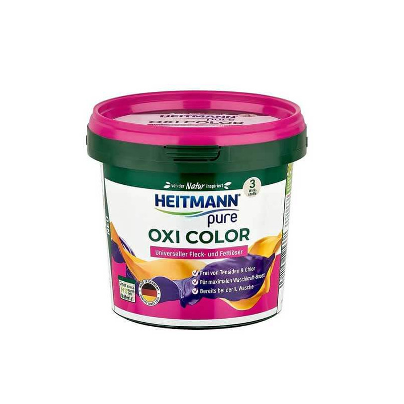 Odplamiacz OXI Color marki Heitmann to skuteczny preparat na bazie aktywnego tlenu, przeznaczony do tkanin białych i kolorowych. Usuwa uporczywe plamy, takie jak czerwone wino, kawa, herbata, owoce, trawa czy tłuszcz, przywracając świeżość i żywość kolorów. Produkt nie jest odpowiedni do wełny i jedwabiu.