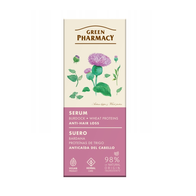 Green Pharmacy Serum przeciw wypadaniu włosów z łopianem i proteinami pszenicy 100 ml to skuteczny kosmetyk dla osób zmagających się z nadmiernym wypadaniem włosów. Regularne stosowanie wzmacnia cebulki, poprawia kondycję skóry głowy i sprawia, że włosy stają się gęstsze, mocniejsze i bardziej odporne na uszkodzenia.