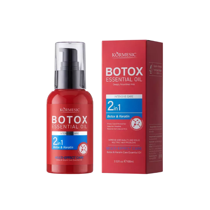KORMESIC Professional Odżywczy i Rewitalizujący Olejek do włosów Botox & Keratin 2w1 100 ml to wszechstronny produkt, który regeneruje, nawilża i wygładza włosy, nadając im miękkość, elastyczność i naturalny blask. Idealny do codziennej pielęgnacji włosów wymagających odbudowy lub dodatkowego blasku.