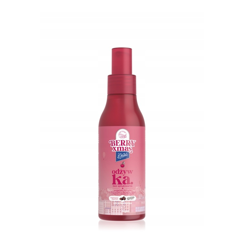 OnlyBio Berry Xmas – Odżywka bez spłukiwania inspirowana zapachem Pawełek Wiśniowy 150 ml to lekka, pielęgnująca odżywka w sprayu, która natychmiast wygładza włosy, ułatwia rozczesywanie i dodaje im miękkości bez obciążenia. Produkt został stworzony z myślą o codziennej pielęgnacji włosów suchych, zniszczonych lub trudnych w układaniu, którym brakuje miękkości i elastyczności. Odżywka nawilża i chroni włosy, redukuje puszenie się pasm oraz wzbogaca rutynę pielęgnacyjną przyjemnym, owocowo‑wiśniowym aromatem inspirowanym klasycznym batonikiem Pawełek Wiśniowy.