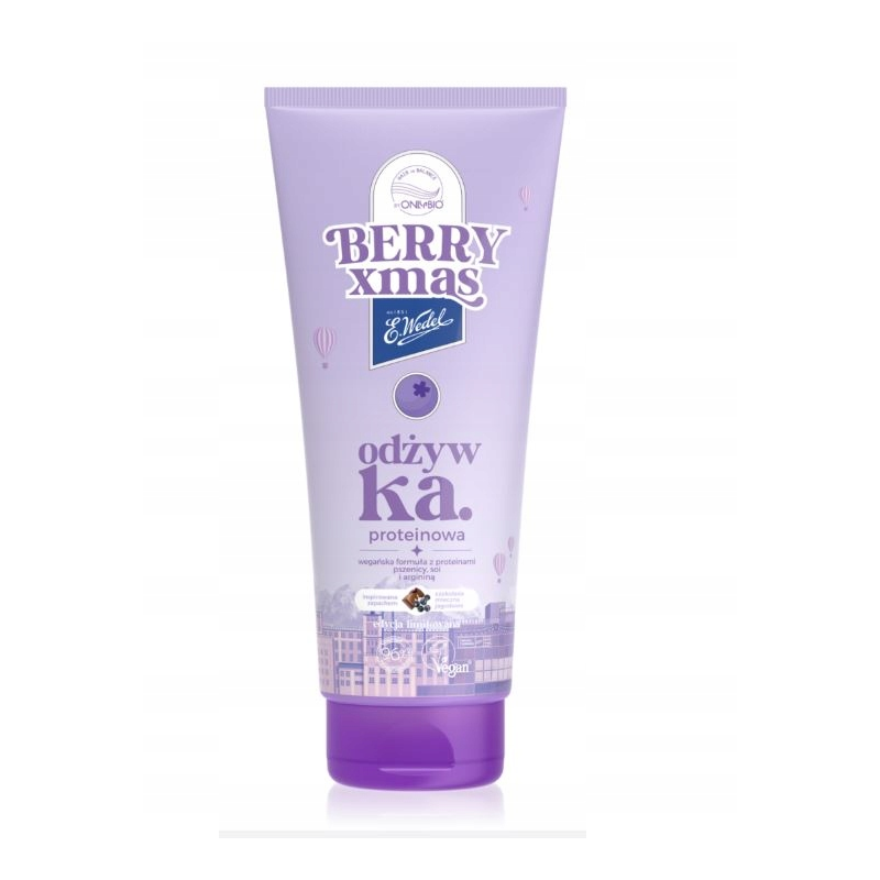 OnlyBio x E.Wedel – Odżywka proteinowa inspirowana czekoladą mleczną jagodową 200 ml to świąteczna, proteinowa odżywka do włosów pozbawionych życia, przyklapniętych i bez objętości. Kremowa, wegańska formuła wzbogacona proteinami roślinnymi odbudowuje strukturę włosa, zwiększa sprężystość pasm i przywraca im zdrowy wygląd oraz blask. Produkt wygładza włosy, ułatwia rozczesywanie i codzienną pielęgnację, a aromat mlecznej czekolady z jagodą uprzyjemnia stosowanie.