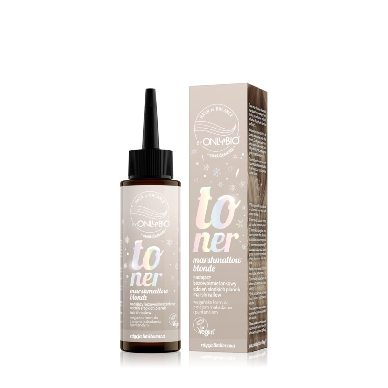 Toner Marshmallow Blonde OnlyBio to kosmetyk do włosów stworzony z myślą o osobach z jasnymi pasmami, które chcą odświeżyć i poprawić ich odcień. Niniejszy toner neutralizuje niepożądane żółte i pomarańczowe tony, nadając blond włosom chłodniejszy, bardziej harmonijny wygląd. Działa łagodnie, bez amoniaku i wody utlenionej, co pozwala dbać o strukturę włosów nawet przy regularnym stosowaniu.