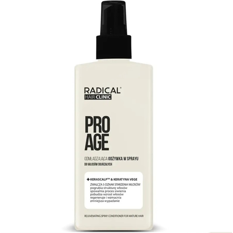 RADICAL PRO AGE ODŻYWKA DO WŁOSÓW W SPRAYU 200ML ODMŁADZAJĄCA nawilża i odbudowuje włosy, przywracając im naturalny blask i elastyczność.