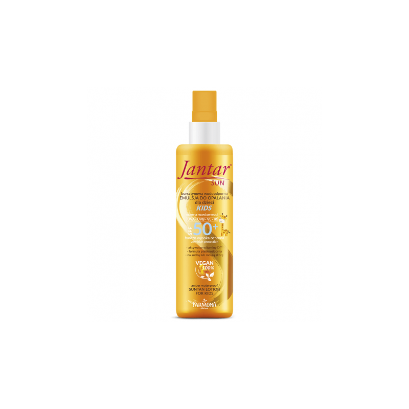 JANTAR SUN BURSZTYNOWA WODOODPORNA EMULSJA DLA DZIECI DO OPALANIU SPF 50+ 200ML to wegańska ochrona przeciwsłoneczna i jednocześnie wyjątkowa bursztynowa pielęgnacja skóry.