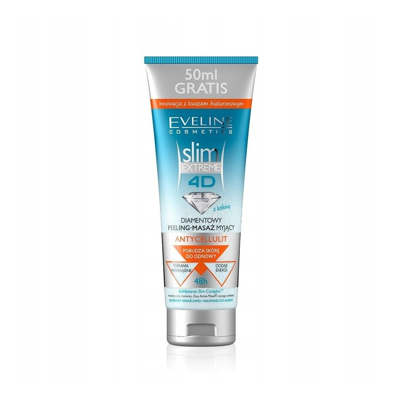 Eveline Slim Extreme 4D — Diamentowy peeling‑masaż do ciała to kosmetyk łączący złuszczanie naskórka z działaniem antycellulitowym i wyszczuplającym. Mikrokryształy diamentu skutecznie usuwają martwe komórki skóry, a kofeina stymuluje mikrokrążenie i wspiera proces spalania tkanki tłuszczowej. Po zastosowaniu skóra staje się jedwabiście gładka, miękka w dotyku oraz bardziej jędrna i elastyczna.