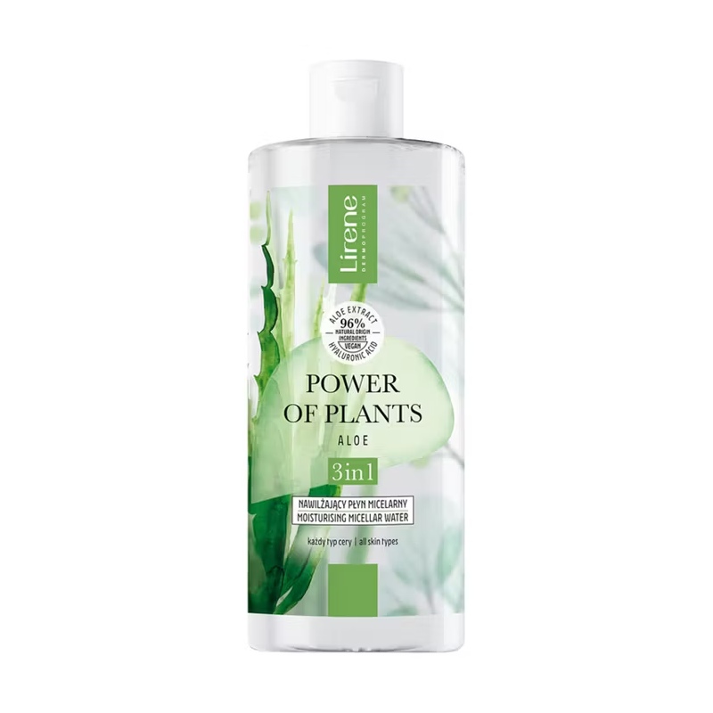 Poczuj moc roślin! Ekspertki Laboratorium Naukowego Lirene stworzyły linię kosmetyków Power of Plants, łącząc moc natury, zamkniętą w ekstraktach, esencjach i olejach roślinnych, z najnowszymi osiągnięciami nauki. Nawilżający płyn micelarny 3 w 1 perfekcyjnie oczyszcza skórę twarzy, oczu i ust z makijażu oraz wszelkich zanieczyszczeń, bez konieczności pocierania. Jest łagodny dla skóry: nie zatyka porów i nie powoduje uczucia ściągnięcia. Zapewnia wysoką tolerancję, nawet gdy nosisz soczewki. Zawiera skuteczne składniki aktywne: 100 % ekstrakt z aloe vera długotrwale nawadnia i łagodzi. Kwas hialuronowy wiąże cząsteczki wody, zapewniając odpowiednie nawilżenie. Micele idealnie oczyszczają, pozostawiając skórę gładką i miękką.